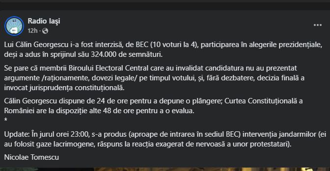 „Se pare că membrii Biroului Electoral Central care au invalidat candidatura nu au prezentat argumente /raționamente, dovezi legale/ pe timpul votului, și, fără dezbatere, decizia finală a invocat jurisprudența constituțională”, se menționează în postarea de pe pagina Radio Iași semnată de Nicolae Tomescu.