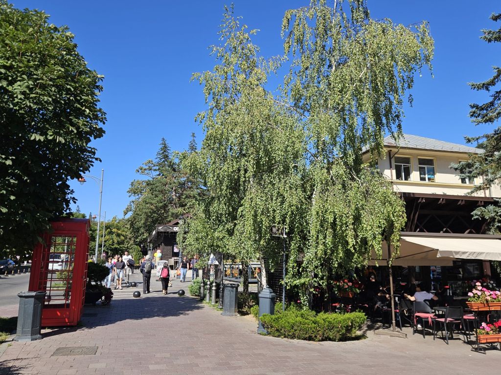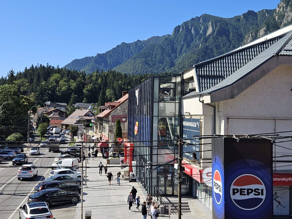 Cum ieși din gară, vezi Munții Bucegi în toată splendoarea, la peste 1.400 de metri altitudine mai sus. La șosea sunt cozi mari doar la patiserie și la o cafenea de lângă pasarela de peste DN1. În rest, la alte terase de la stradă nu prea era lume, deși era vineri după prânz, iar afară temperatura se apropia de 30 de grade.