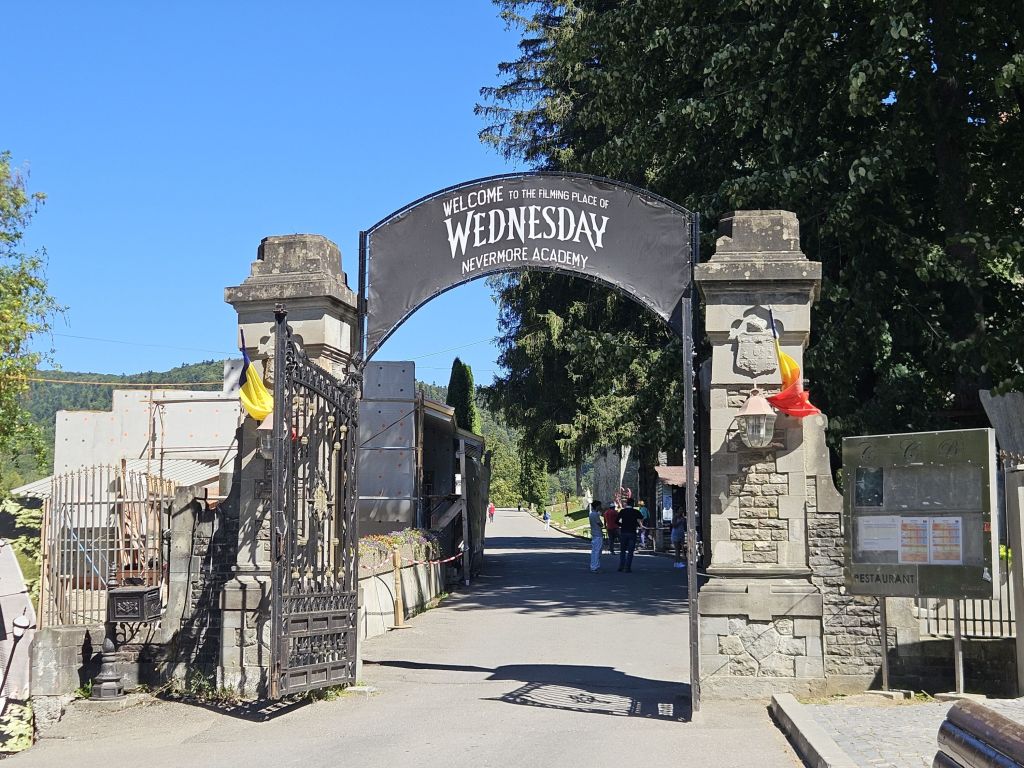 În plimbarea prin Bușteni am ajuns și la faimosul Castel Cantacuzino, devenit celebru în toată lumea pentru serialul Wednesday de pe Netflix. Și la poarta de la intrare scrie „Nevermore”, academia fictivă din film unde sunt „școliți” adolescenții cu puteri supranaturale.