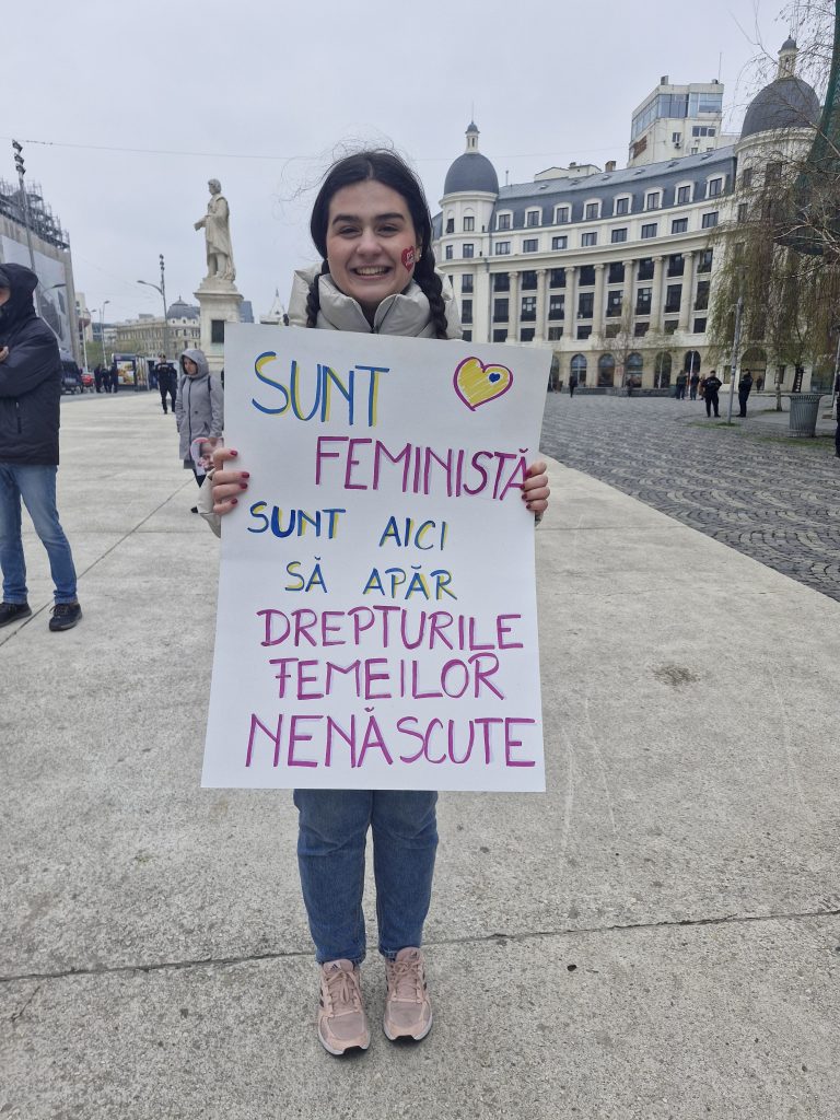 Printre voluntari este și Ștefania, studentă de 19 ani. Mă abordează și mă întreabă ce părere am despre feminism. Ea vede o legătură între această ideologie și mesajele „pro-viață”, pe care o exprimă prin mesajul pe care îl afișează.