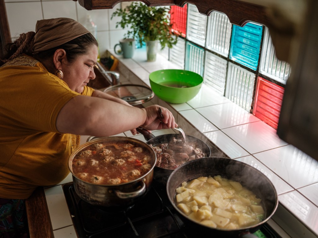 Singurătatea apasă mai greu atunci când copiii sunt la școală. Marina face curățenie, bagă haine la spălat, apoi gătește ciorbă de perișoare, pui cu mazăre sau ficăței cu piure, mâncărurile preferate ale copiilor, care vin la ora 12 să mănânce acasă. Au încercat să-i lase la cantina școlii împreună cu colegii lor, dar nu le-a plăcut mâncarea. „Li s-a făcut rău când au văzut supa aia verde”, spune Marina.