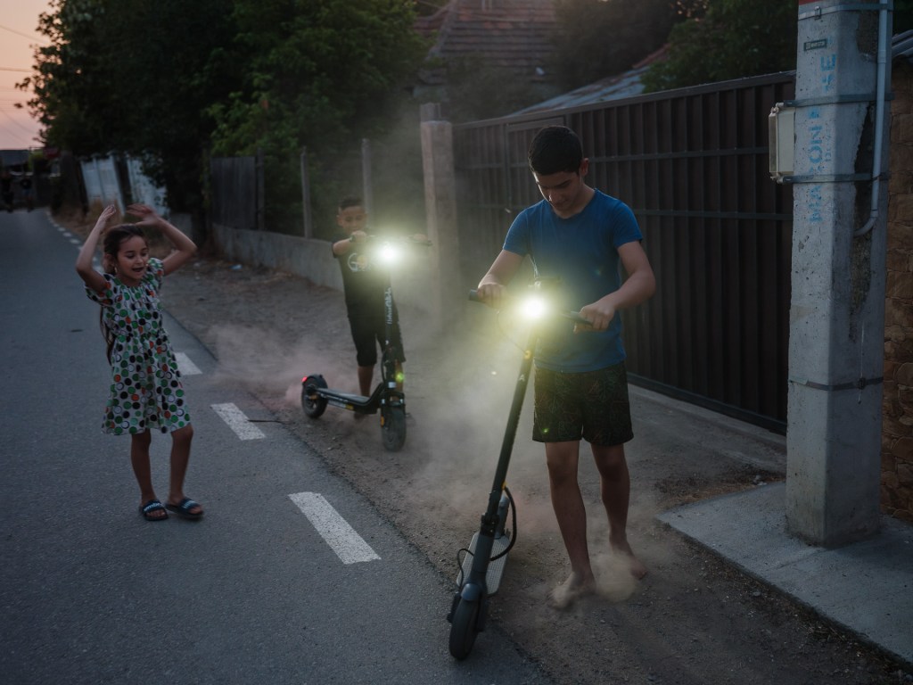 Copiii lui Alin, fetele lui Geo și verișorii lor, Denisa, 14 ani, și Emanuel, 12, nepoții Vergianei și ai lui Cioabă, se joacă în curte. Emanuel a primit o trotinetă electrică nouă de la tatăl lui și le plimbă pe fetițe pe rând.