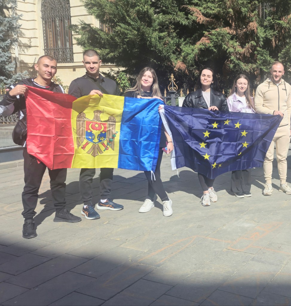 Între cele două secții întâlnim un grup de tineri din Republica Moldova care poartă două steaguri, cel al țării lor și cel al Uniunii Europene. Când le-am cerut acordul să le facem o poză, au început să râdă, spunând că toată lumea vrea să facă poze cu ei.