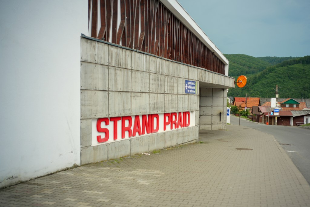 Vizavi de centrul Wellness se aude doar zgomotul de la lucrările de scoaterea apei din salină. Ștrandul e pustiu în bătaia soarelui, cu lacătul pus pe ușă.