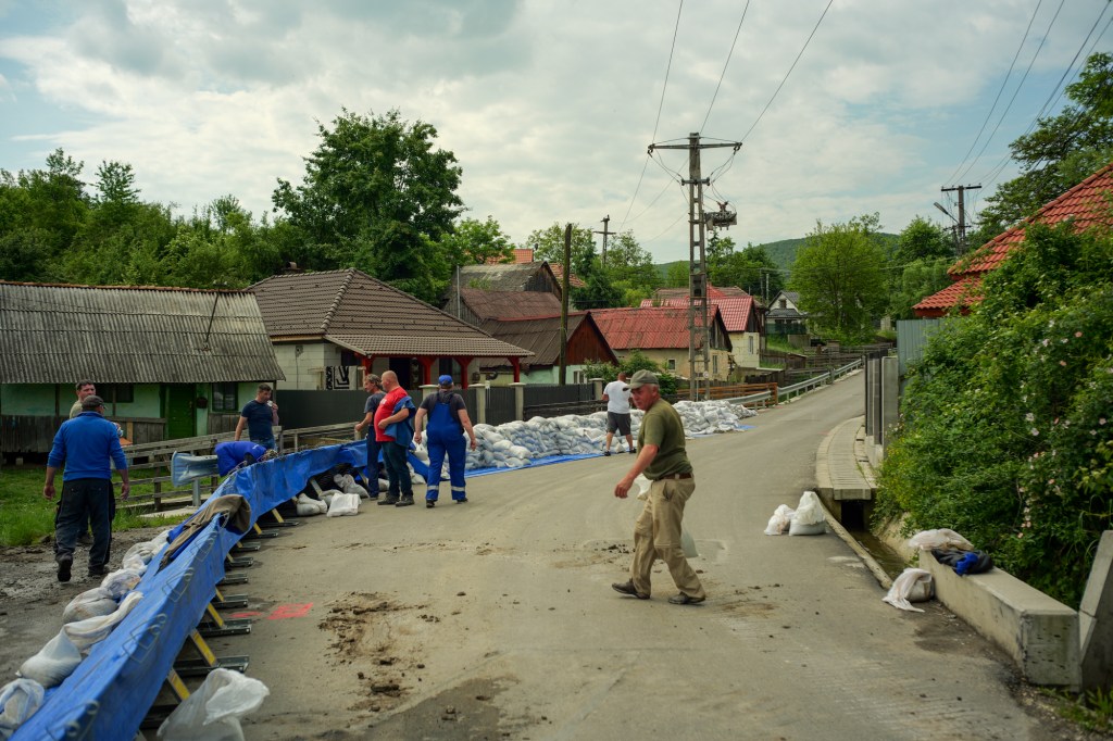În apropiere, de-a lungul străzii, muncitorii de la Apele Române Mureș, alături de mai mulți voluntari ridică sacii pentru construirea digurilor care să modifice cursul apei.