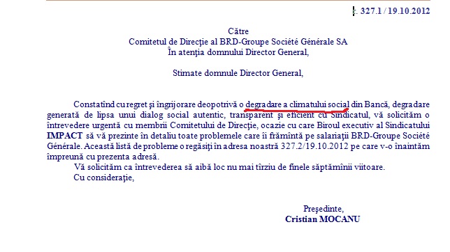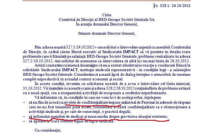 Sindicatul din banca s-a adresat proaspatului Director General, caruia i-au adresat cateva intrebari, nemultumiti de modul opac in care are loc reorganizarea activitatii interne. Stimate domnule Director General, avind in vedere prevederile Art. 30, alin. 3 din Legea 62/2011 a Dialogului social, consideram neindeplinita obligatia Patronatului BRD-Groupe Societe Generale de a informa Sindicatul cu privire la hotaririle Consiliului de Administratie (CA) sau ale Comitetului de Directie (CD) in probleme de interes profesional, economic si social.