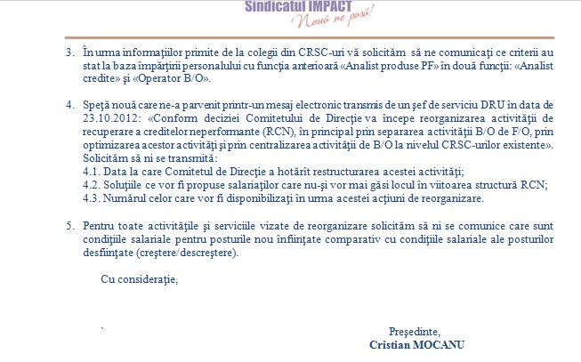 - In consecinta, va solicitam sa ne comunicati daca in perioada 01.01.2012-19.10.2012 au avut loc sedinte ale CA sau CD in care s-au luat hotariri cu impact asupra locurilor de munca ale salariatilor Bancii.