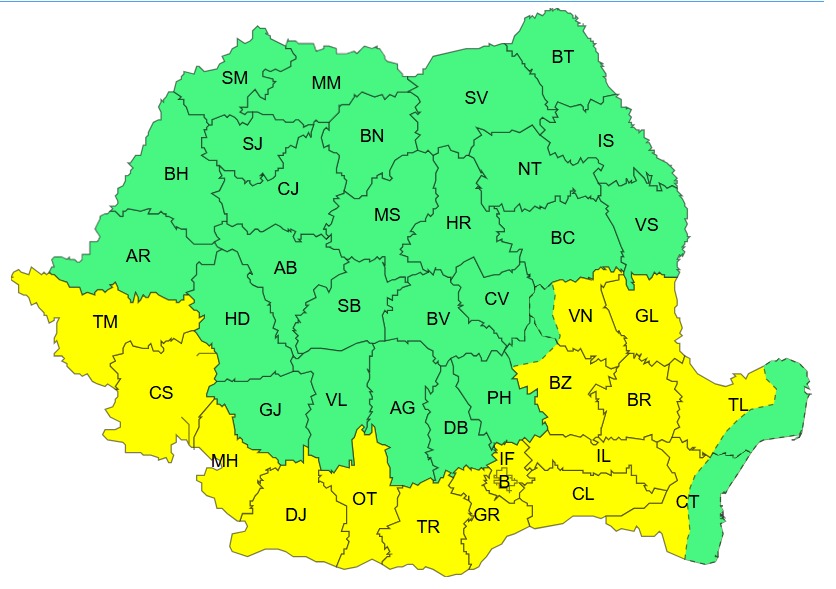 O altă atenţionare Cod galben vizând temperaturi deosebit de ridicate, caniculă şi disconfort termic va fi în vigoare miercuri, între orele 12:00 şi 21:00, în judeţele Mehedinţi, Gorj, Dolj, Olt, Vâlcea, Argeş, Dâmboviţa, Teleorman, Giurgiu, Ilfov, Prahova, Buzău, Vrancea, Galaţi, Brăila, Ialomiţa, Călăraşi, în municipiul Bucureşti şi parţial în judeţele Constanţa şi Tulcea.