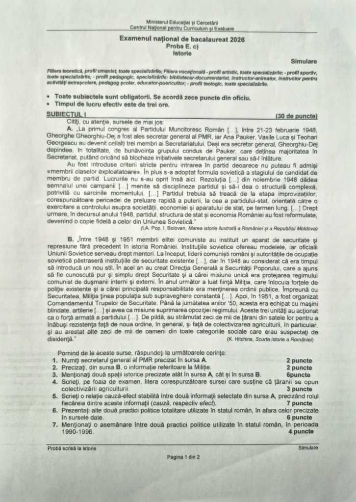 „La primul subiect, avem două surse istorice, sursa A și sursa B, ambele despre perioada de început a comunismului din România, adică perioada de instaurare a stalinismului din România. Primele exerciții sunt pe baza surselor istorice, de la exercițiul 1 până la exercițiul 5.