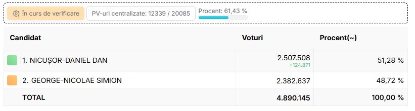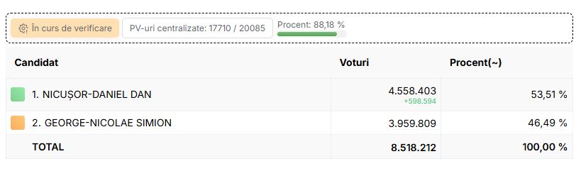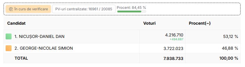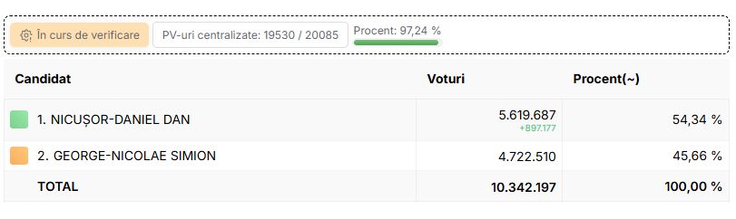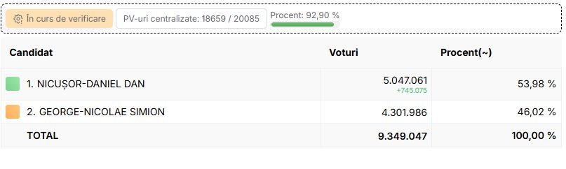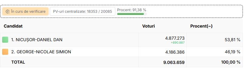 Au fost centralizate toate procesele verbale din cele 20.085 de secții. Rezultatele finale ale alegerilor prezidențiale, turul 2, din 18 mai 2025, arată că Nicușor Dan a câștigat scrutinul cu un avans de 829.589 de voturi.