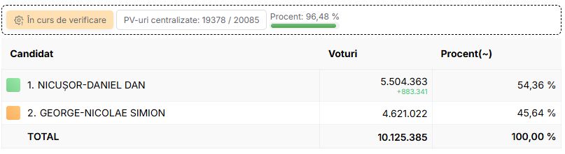 Am ajuns la 10,3 milioane de voturi numărate, iar diferența se apropie de 900.000 de voturi în favoarea lui Nicușor Dan.