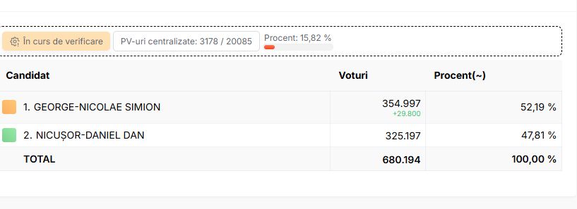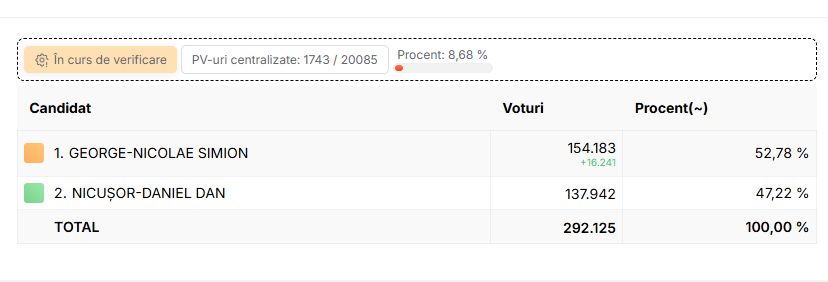 Peste 290.000 de voturi au fost deja numărate. Diferența este una mică în favoarea lui George Simion, dar până acum au fost numărate foarte puține voturi și din secții mici.