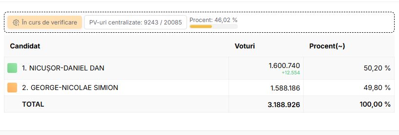 Au fost numărate peste 3 milioane de voturi. Nicușor Dan a trecut în față cu un avantaj minim.
