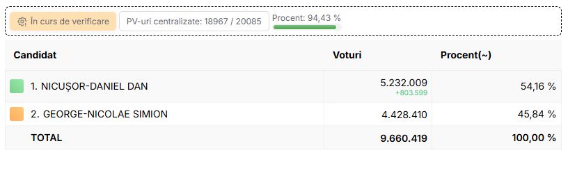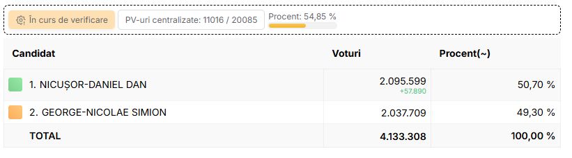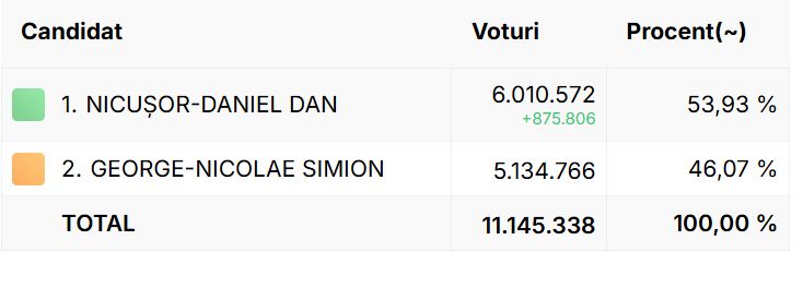 Peste 6,5 milioane de voturi au fost numărate din totalul de 11,6 milioane de voturi. Nicușor Dan are un avantaj de 290.000 de voturi.