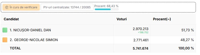 Peste 9 milioane din cele 11,6 milioane de voturi au fost numărate, iar Nicușor Dan are un avans de aproape 700.000. Din diaspora au fost numărate 166.000 de voturi din 1,6 milioane.