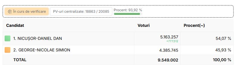 La 9,5 milioane de voturi de voturi numărate, diferența între Nicușor Dan și George Simion este de 777.000 de voturi.