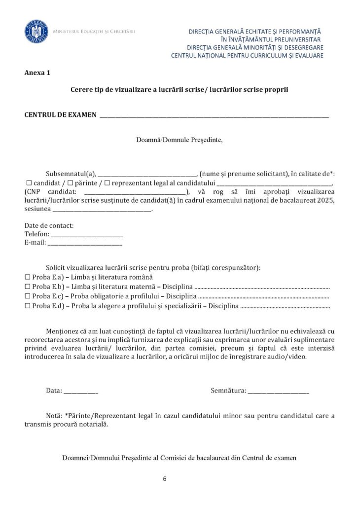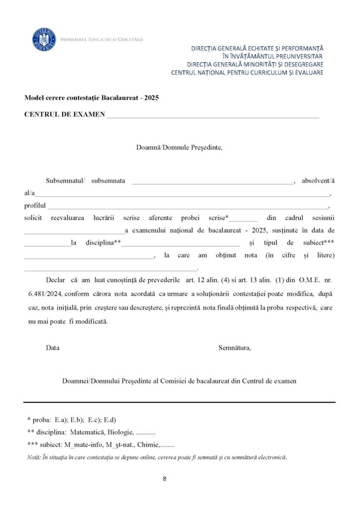 Candidații care depun contestații completează și semnează o declarație-tip în care se menționează faptul că au luat cunoștință că nota acordată ca urmare a soluționării contestației poate modifica nota inițială prin creștere sau descreștere, după caz.