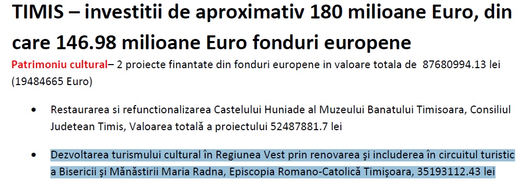 In prezentarea titrata „TIMIS – investitii de aproximativ 180 milioane Euro, din care 146.98 milioane Euro fonduri europene”, Elena Udrea se lauda cu „dezvoltarea turismului cultural în Regiunea Vest prin renovarea şi includerea în circuitul turistic a Bisericii şi Mănăstirii Maria Radna”.