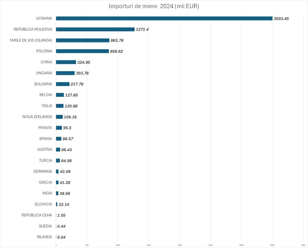 Statele membre UE au importat în 2023 din ţările situate în afara blocului comunitar aproape 164.000 tone de miere naturală. În contrast, în 2023, doar 24.900 tone au fost exportate de statele membre UE în afara blocului comunitar.