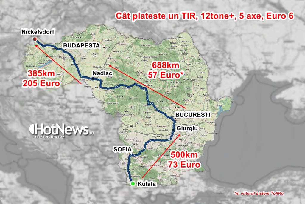 Aplicând tarifele propuse pentru sistemul TollRo, TIR-ul va plăti 57,2 Euro – o sumă mai mică decât în Bulgaria. Cu alte cuvinte, deși același TIR parcurge cu 37% mai mult drum în România, plătește cu 28% mai puțin.
