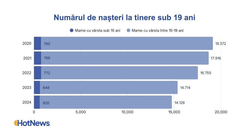 În 2024, din cele 148.916 naşteri înregistrate, 17.746 (9,90%) au fost la mame sub 19 ani: 620 de fete sub 15 ani și 14.126 de adolescente cu vârsta între 15-19 ani, potrivit INS.