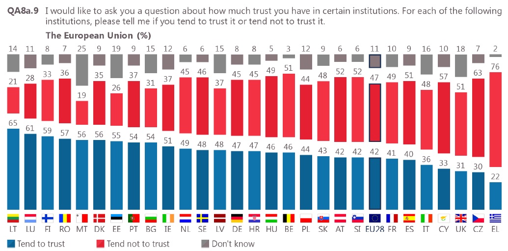 Increderea in UE sporeste in continuare, ajungand la 42 % (fata de 36 % in toamna lui 2016 si 32 % in toamna lui 2015). Cel mai mult a crescut in Franta (41 %, +15 puncte), in Danemarca (56 %, +11) si in Estonia (55 %, +11). Nivelul de incredere a crescut cu 10 puncte si in Germania, ajungand la 47 %.