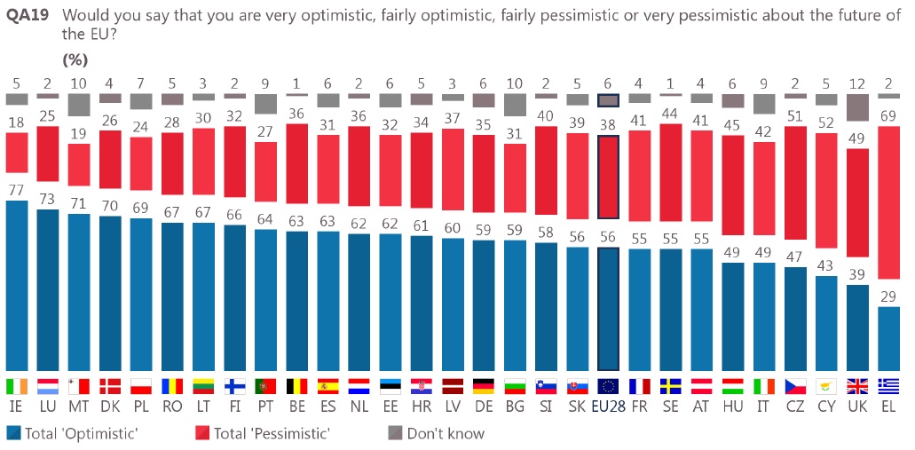 Cei mai multi europeni (56 %) sunt optimisti in legatura cu viitorul UE – o crestere de sase puncte procentuale fata de toamna anului 2016. Cresterile cele mai semnificative au fost observate in Franta (55 %, +14 puncte fata de toamna trecuta), Danemarca (70 %, +13) si Portugalia (64%, +10).