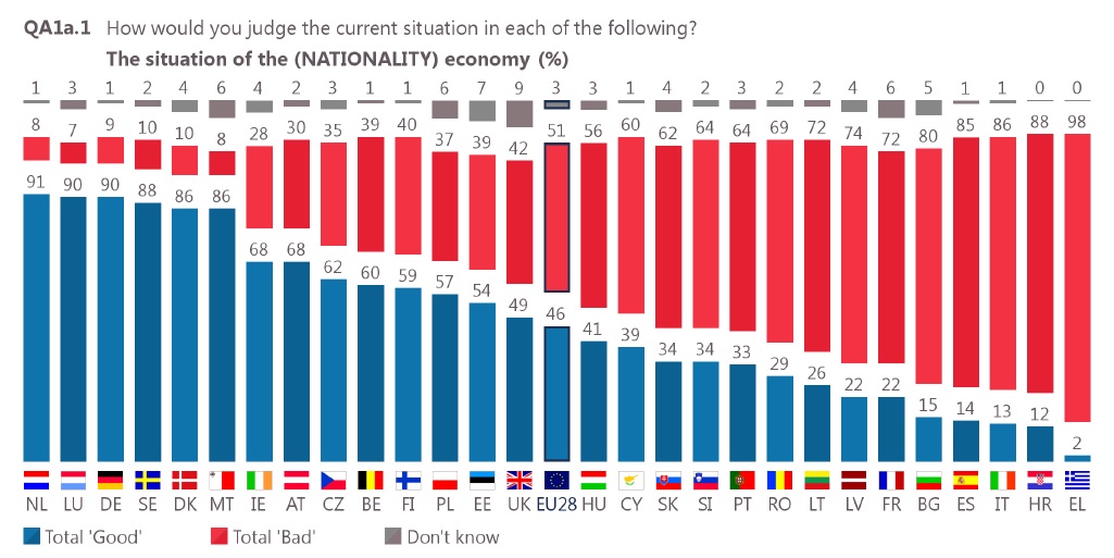 Aproape jumatate dintre europeni considera ca in tara lor, situatia economica este, in prezent, buna (46 %, +5 puncte procentuale fata de toamna anului 2016). Procentul a crescut semnificativ in ultimii ani (+ 20 puncte fata de primavara anului 2013, +26 puncte fata de primavara anului 2009).