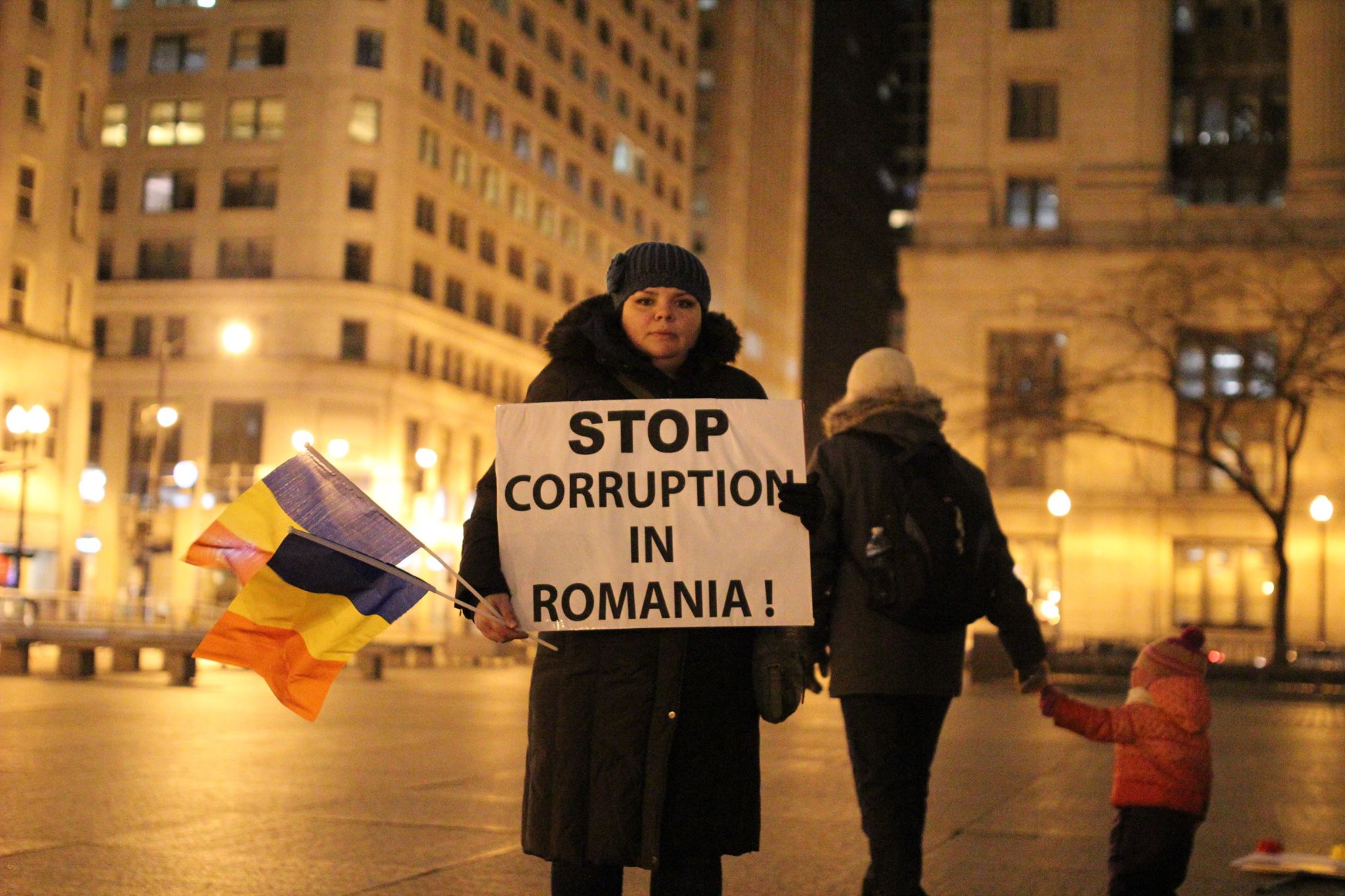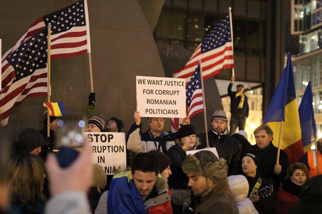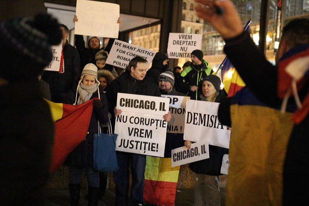 Si in orasul american Chicago din Illinois aproximativ 100 de romani au protestat sambata, denuntand ordonantele de urgenta adoptate de Guvern pentru modificarea codurilor penale. Printre mesajele afisate: „Oamenii rai fura Romania, oamenii buni iubesc Romania” sau „Chicago IL, Nu coruptie! Vrem justitie!”.