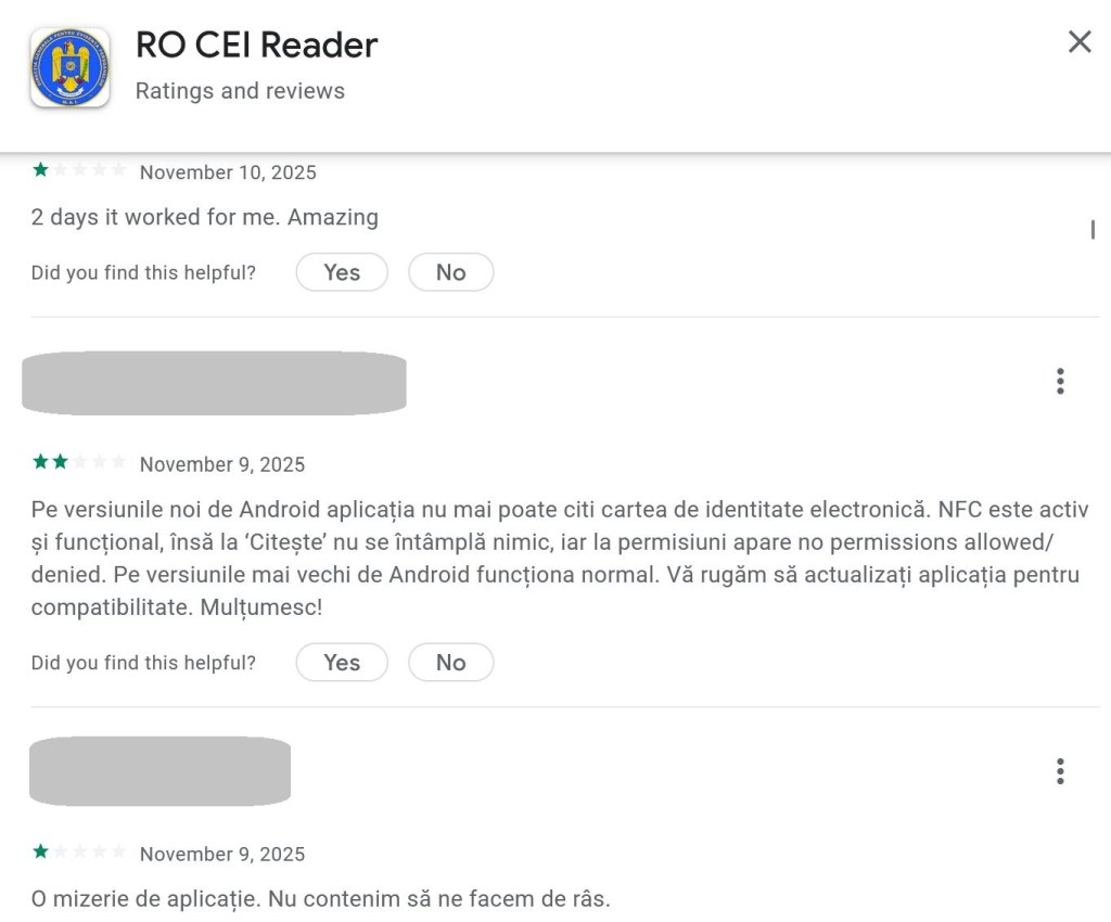 Recenziile făcute pe Google Play de utilizatorii români care au descărcat aplicația mobilă dezvoltată de MAI arată că aceasta dă și anumite erori la autentificare sau la citirea informațiilor de pe CEI.