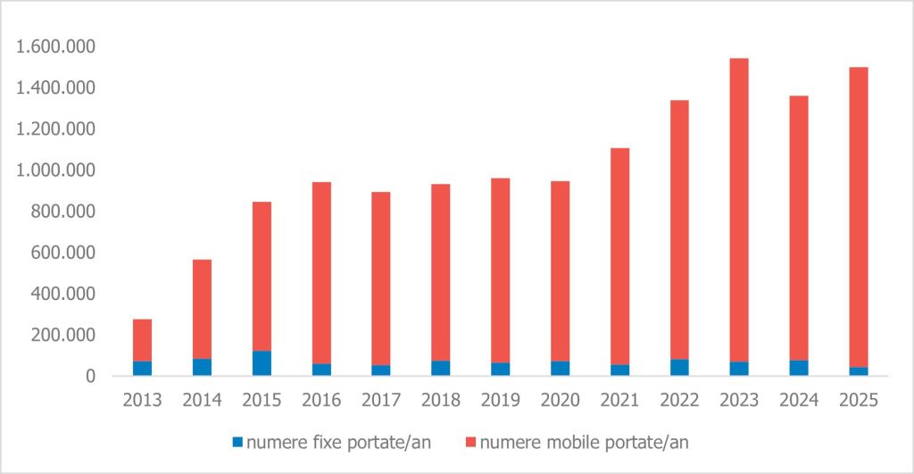 Anul trecut au fost portate 1.497.999 numere de telefon, din care 97% au fost numere de telefonie mobilă, restul fiind numere de telefonie fixă. În medie, în 2025 s-au efectuat peste 124.000 de portări lunar, luna decembrie înregistrând cel mai ridicat volum, peste 170.000.