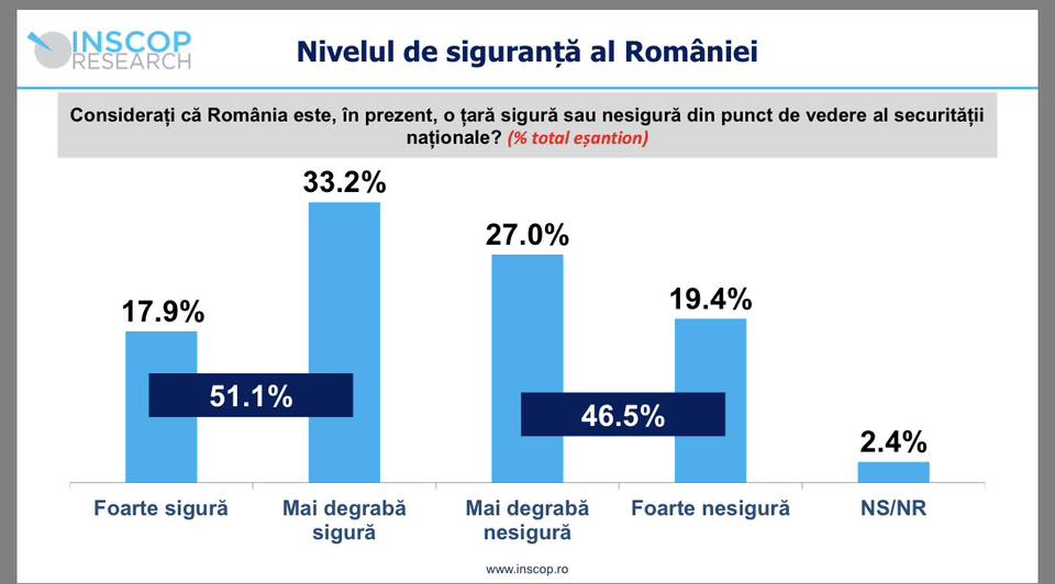 Întrebați dacă, în prezent, România este o țară sigură sau nesigură din punct de vedere al securității naționale, 17.9% dintre români au apreciat că este foarte sigură, 33.2% mai degrabă sigură, 27% mai degrabă nesigură, iar 19.4% foarte nesigură. Ponderea non-răspunsurilor este de 2.4%.