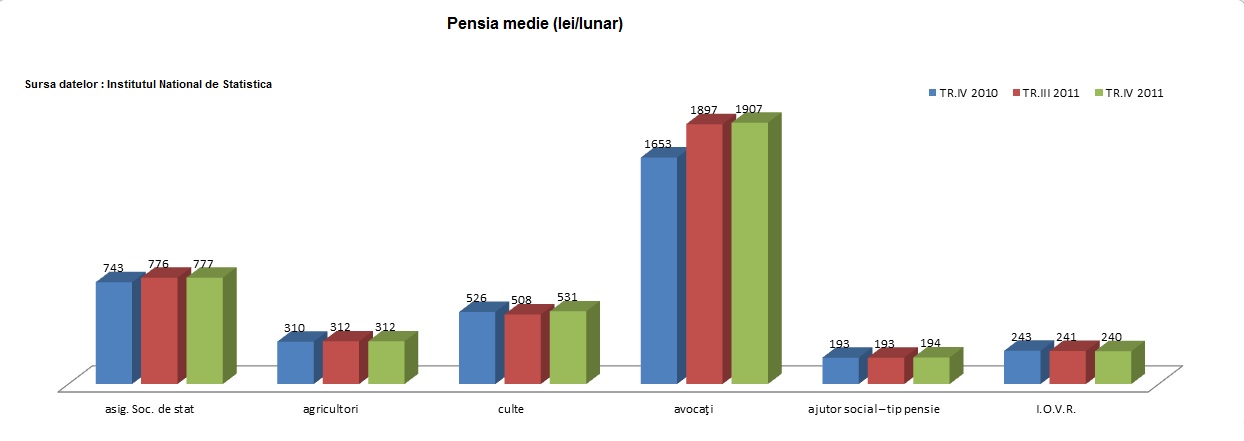 Pensia medie de asigurari sociale de stat a fost de 777 lei in trimestrul IV 2011, cu diferente mari intre zonele geografice, diferentele dintre valoarea minima si cea maxima depasind 350 de lei (623 lei in judetul Giurgiu fata de 979 lei in Municipiul Bucuresti).