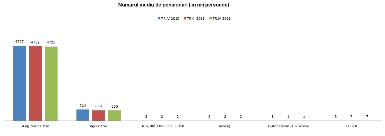 Numarul mediu de pensionari din Romania la finalul anului trecut a fost, potrivit calculelor INS, de 5,555 milioane persoane, in scadere cu 106.000 persoane fata de ultimul trimestru din 2010 si cu 21.000 persoane fata de trimestrul III 2011. Pensia medie lunara a fost in trimestrul IV 2011 de 760 lei, mai mare cu 5,4% fata de acelasi trimestru al anului precedent si cu 0,3% fata de trimestrul III 2011, mai arata Statistica.