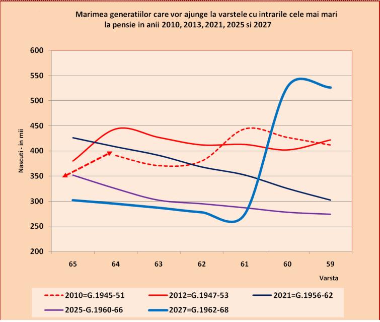 Populatia Romaniei ar putea ajunge in anul 2030 la 19,2 milioane locuitori, ceea ce ar insemna un recul de 4 milioane fata de inceputul anului 1990 si de 2,2 milioane fata de 1 ianuarie 2011. In 2030, varsta standard de pensionare va ajunge la 65 de ani atat pentru barbati, cat si pentru femei. Cele 5,7 milioane de pensionari de la inceputul anului 2011 reprezinta 27% din populatia tarii. Pentru sistemul public de pensii, mai proasta veste nici ca se putea. Vezi cum va evolua pe ani si grupe de varsta numarul pensionarilor si mai ales, care este generatia care peste 10 ani va depune efortul financiar pentru ca acestia sa beneficieze de pensie.