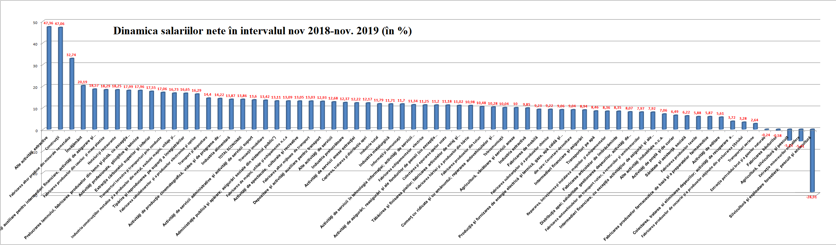 Mai jos, creșterile/scăderile salariilor nete în intervalul noiembrie 2019/noiembrie 2018
