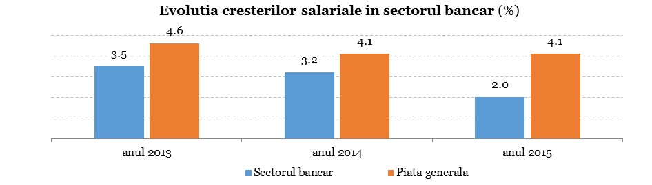„In 2015, cresterile salariilor din banci au fost mai mici decat media cresterilor salariale din economie. Astfel, daca salariile in Romania au urcat cu 4.1% in medie, in banci creseterea a fost de 2%, a transmis vineri la solicitarea HotNews.ro Nicoleta Dumitru, Manager, Consultanta in Resurse Umane, PwC Romania. In plus, mai spune Dumitru, desi la nivel de piata generala procentul de crestere salariala se mentine relativ constant in ultimii trei ani, pe piata bancara acesta este in descrestere. Aceasta tendinta poate fi explicata prin schimbarile interne din banci, acestea confruntandu-se in continuare cu restructurari de portofolii si achizitii, cat si cu influente macro-economice extreme, mai crede Nicoleta Dumitru.