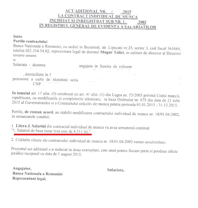 BNR nu a facut niciodata publice salariile din institutia pe care guvernatorul Isarescu o pastoreste de 26 de ani, dar asta nu inseamna ca nu mai “scapa” cate un contract de munca. Inainte de a da o mostra dintr-un act aditional incheiat in toamna trecuta, as vrea sa fac doua observatii: prima, ca schema de personal a Bancii este supra-gonflata, pentru a face loc unor “apropiati” (sa le spunem asa) fara merite bancare deosebite. Au fost la momentul potrivit in locul potrivit si a fost suficient. A doua observatie este ca si in interiorul Bancii exista- ca in orice institutie- frustrari si nemultumiri legate de ocupantii anumitor posturi-cheie. Si acum sa dam facsimilul, scrie Dan Popa pe blogul Hymerion.ro.