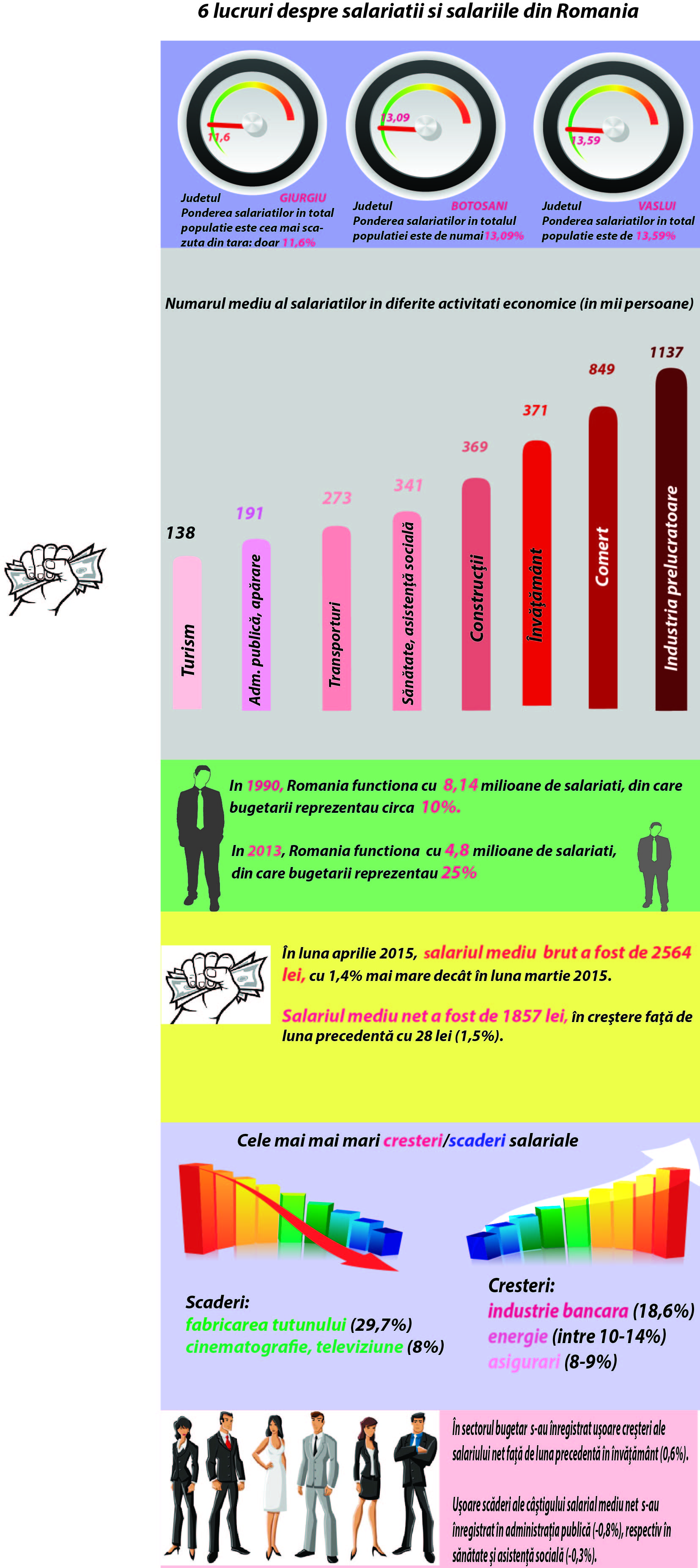 Salariul mediu net din aprilie: 1857 lei, mai mare cu 28 de lei decat in martie. Vezi in text un infografic pe tema salariilor si a salariatilor din Romania