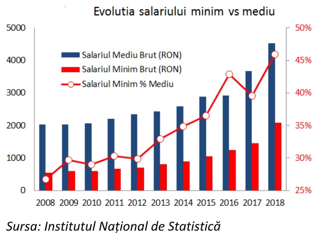 „Astfel, ponderea salariului minim în salariul mediu a crescut de la 27% (anul 2008) la 46% (finalul anului 2018), peste nivelul înregistrat în Ungaria (38%), Cehia