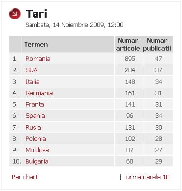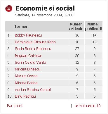 Dorim sa va prezentam o serie de topuri tematice, realizate in mod automat prin analiza articoleor din ultimele aproximativ 2 zile. Topurile nu exprima ierarhi valorice, nici macar de notorietate, ci ordonari dupa acelasi criteriu al vizibilitatii, cu care v-am obisnuit. Comentariile sunt de prisos. Nu pentru ca pozele ar dezvalui adevaruri clare si zguduitoare, ci pentru ca fiecare e liber sa le interpreteze cum vrea.