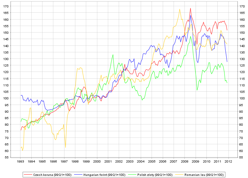 Daca ne uitam si la evolutia leului comparat cu monedele tarilor din jur, datele BCE ne indica urmatorul grafic: