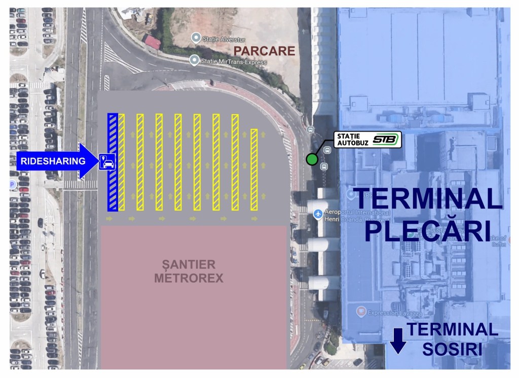 Începând de joi, ora 00:00, zona de preluare pentru ride-sharing se mută la „Plecări”, conform indicațiilor pe care companiile de transport alternativ le vor oferi pe harta de preluare a călătorilor. Zona a fost identificată și aprobată în colaborare cu reprezentanții companiilor de transport alternativ.