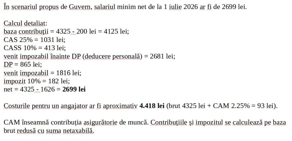 Creșterea salariului minim brut la 4.325 de lei, cu reducerea de la 300 de lei la 200 de lei a sumei neimpozabile, de la 1 iulie 2026, va însemna un salariu net de 2.699 de lei, deci un plus de 125 de lei, în timp ce costurile pentru angajator vor crește cu 284 de lei, a explicat pentru HotNews.ro expertul contabil Cosmin Dumitrașcu.