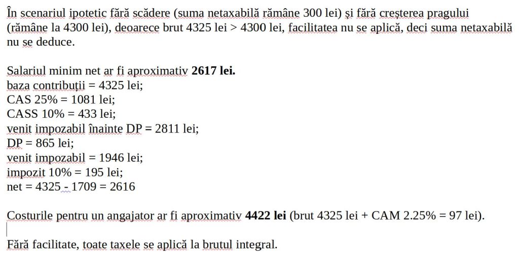 În scenariul ipotetic fără scădere (suma netaxabilă rămâne 300 lei), dar cu creșterea pragului la 4600 lei, deoarece salariul minim brut ar fi sub plafonul de 4.600 de lei, scutirea se aplică. În acest caz, salariul minim net ar fi de 2.741 de lei, iar costul pentru angajator ar fi de 4.416 lei.