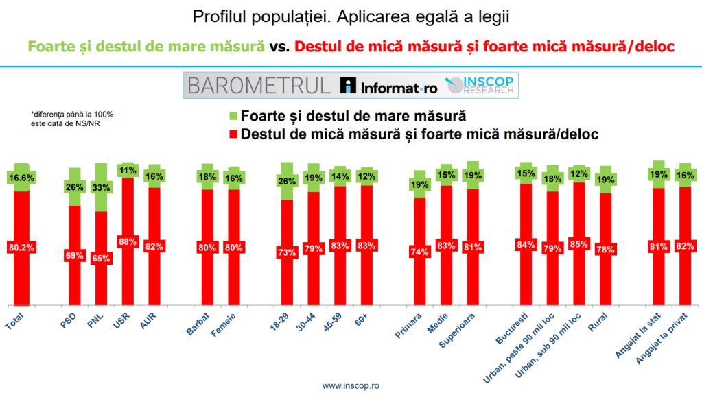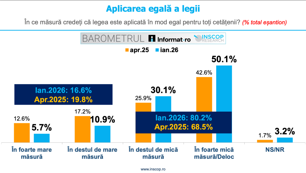 Sondajul arată că 80,2% dintre români cred în destul de mică măsură/ în foarte mică măsură că legea este egală pentru toată lumea. În aprilie 2025, 68,5% credeau în destul de mică măsură, în foarte mică măsură sau deloc că legea este aplicată în mod egal pentru toți cetățenii, iar în ianuarie 2026, procentul a crescut la 80,2%.