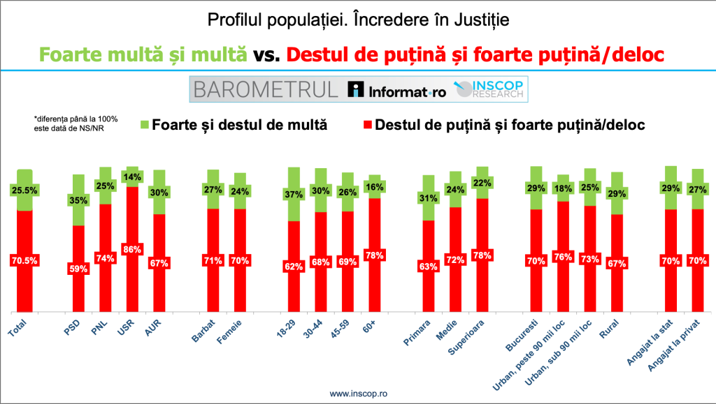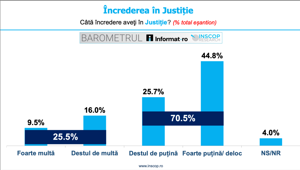 Potrivit sondajului INSCOP, 25,5% dintre cetățenii României au foarte multă sau destul de multă încredere în justiție. La polul opus, peste 7 din 10 români spun că au destul de puțină sau foarte puțină încredere în sistemul judiciar.