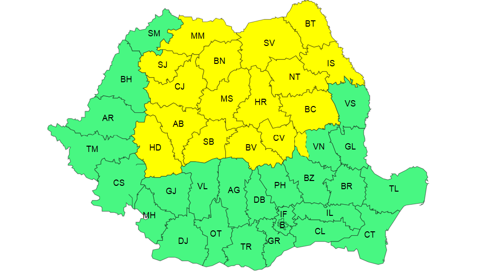 În același timp, ANM a emis un cod galben de furtuni și vijelii, pentru ziua de duminică, între orele 13:00-21:00, în Transilvania, Maramureş, sudul Banatului, nordul Moldovei şi în cea mai mare parte a zonei montane.