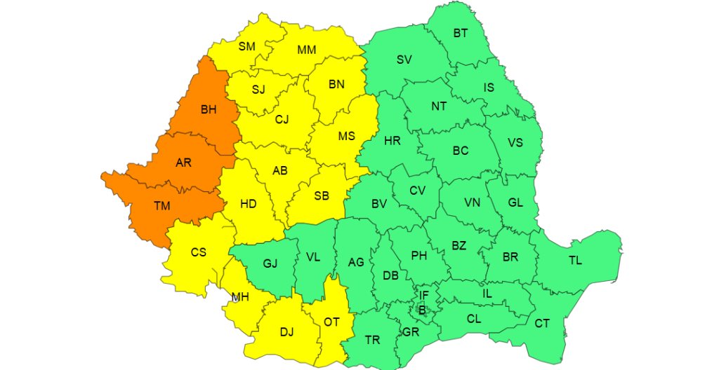 Astăzi, este în vigoare o avertizare cod portocaliu, în intervalul orar 12 – 21, în judeţele judeţele Bihor, Arad, Timiş, unde sunt anunţate val de căldură, temperaturi deosebit de ridicate, caniculă şi disconfort termic accentuat. Temperaturile maxime vor fi de 37…38 de grade.