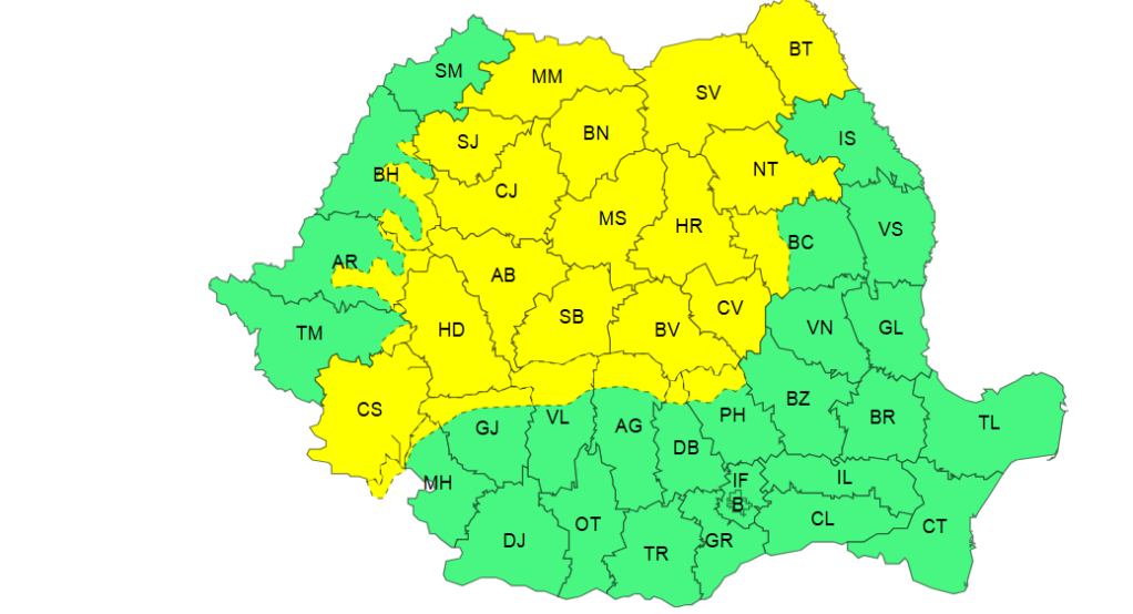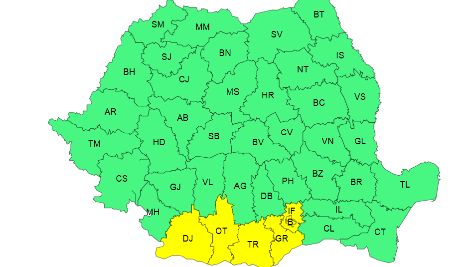 În acelaşi interval este valabilă o avertizare cod galben, fiind anunţate val de căldură, temperaturi deosebit de ridicate, caniculă şi disconfort termic ridicat, în Maramureş, nordul Crişanei, sudul Banatului, cea mai mare parte a Transilvaniei, vestul şi sudul Olteniei, sud-vestul şi centrul Munteniei. Temperaturile maxime vor fi cuprinse între 33 și 37 de grade, cu cele mai ridicate valori în sud-vestul țării.